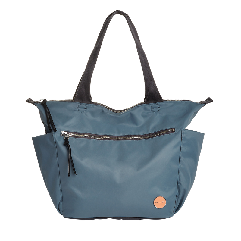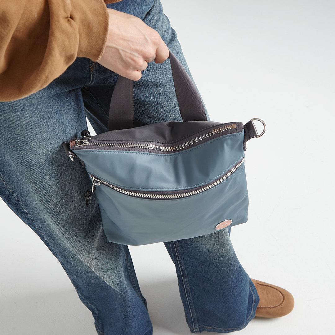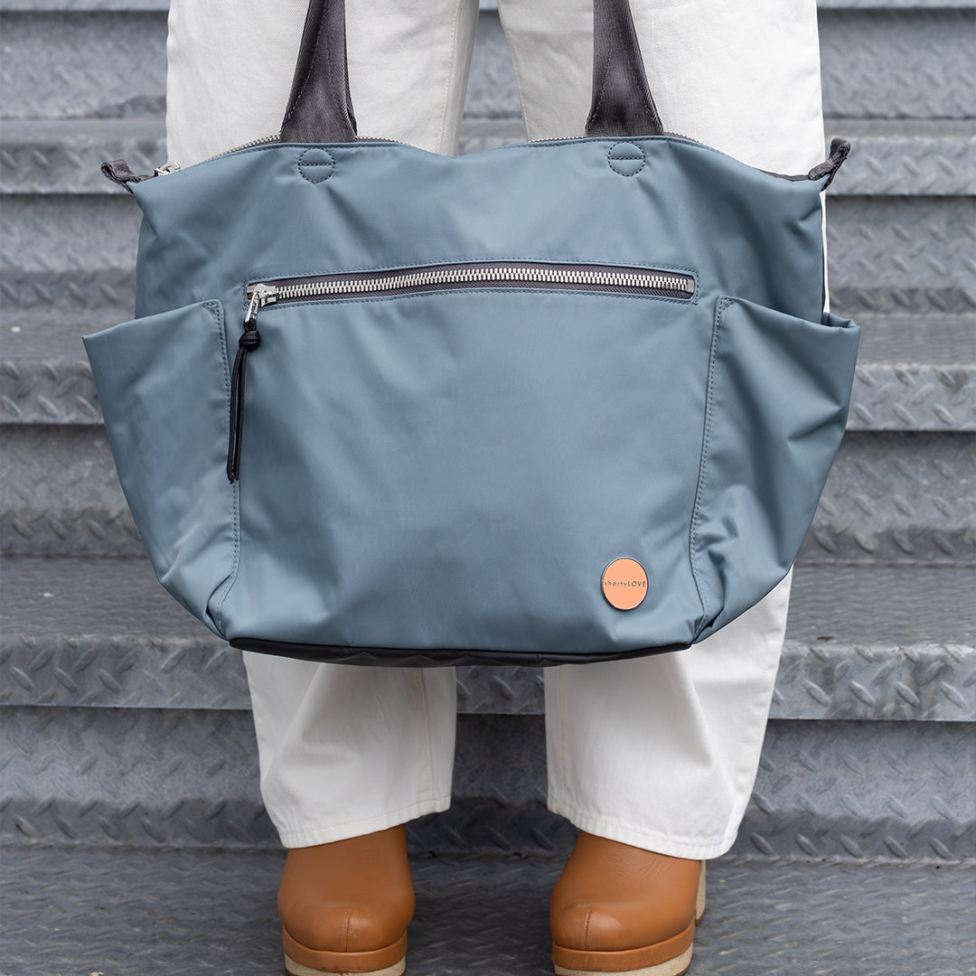 a whole mood. and that steel blue/charcoal handbag mood is two-fold: reminiscent of well-worn denim on one side with a dramatic, stormy grey on the other. this stunner works with white, khaki, camel, black, greys and your favorite jeans. pair with fiery reds, warm blush or sunny apricot for contrast.