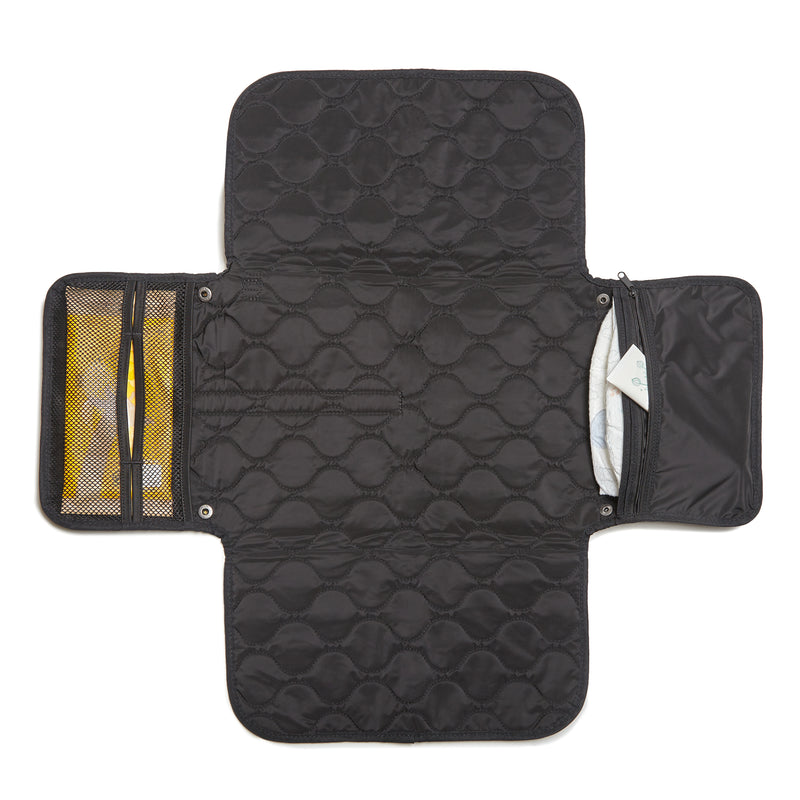 the word to remember here is ‘portable.’ that means pack light and organize your diaper changing mat storage with the absolute essentials. the biz makes it easy with two fold-out wings on either side of the changing area. on the left: a mesh pocket that expands to hold your wipes dispenser, with an opening for easy access. on the right: a zip pocket to hold diaper balm, hand sanitizer or sanitizing spray, and a pacifier or teether, plus two slide pockets for diapers and disposable bags. your baby bag — like our boxer backpack or ranger crossbody tote — will hold other necessities like a change of clothes and baby bottles, so keeping your mat storage down to a science doesn’t mean you’re not prepared!